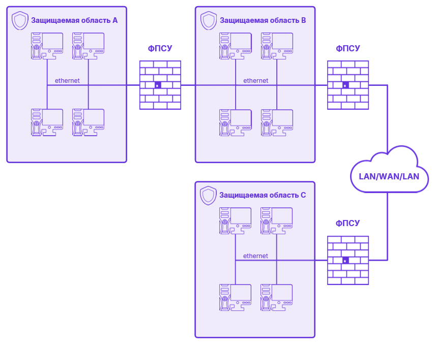 Каскадная установка нескольких ФПСУ и запрет открытых соединений на последнем комплексе создают максимальный уровень защиты для оконечной области (область А, рисунок ниже), предоставляя доступ к ней только аутентифицированным абонентам. При этом подсистема фильтрации создаёт достаточно высокий уровень защиты от НСД и для абонентов транзитной защищаемой области В, позволяя им осуществлять соединения с абонентами других сетей (не защищённых) через глобальную сеть. Обратите внимание, что для абонентов оконечной области фильтрация пакетов по всем заданным критериям будет производиться только ближайшим комплексом, а транзитный ФПСУ будет фильтровать пакеты только по IP‑адресам.