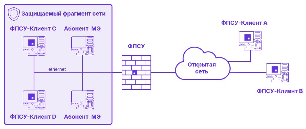 На схеме (см. рисунок ниже), ФПСУ обеспечивает пользователям ФПСУ-IP/Клиентов А и В безопасный доступ к абонентам защищаемой им подсети. Взаимодействуя через ФПСУ друг с другом, ФПСУ-IP/Клиенты А и В образуют VPN-подсеть в открытых сетях, а ФПСУ-IP/Клиенты С и D ‑ VPN‑подсеть внутри защищённого фрагмента. Каждый из ФПСУ-IP/Клиентов А и В может также образовывать VPN-соединения через ФПСУ с ФПСУ-IP/Клиентами С и D.