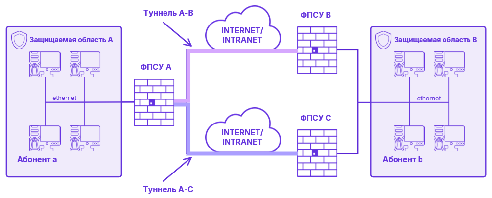 Абонент а → ФПСУ А → туннель А-B → ФПСУ B → Абонент b;