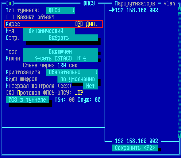 Стандартный вариант построения VPN-туннеля между двумя ФПСУ предполагает, что администратору локального ФПСУ известен постоянный IP-адрес удаленного ФПСУ. В случае, когда удаленный ФПСУ подключается к сегменту сети передачи данных через провайдера, выдающего сетевым устройствам временный IP-адрес, стандартный вариант построения VPN-туннеля не подходит. Администратор ФПСУ может отметить такой удаленный ФПСУ как «Дин. (Динамический)», разрешая установление туннеля с произвольного IP-адреса.