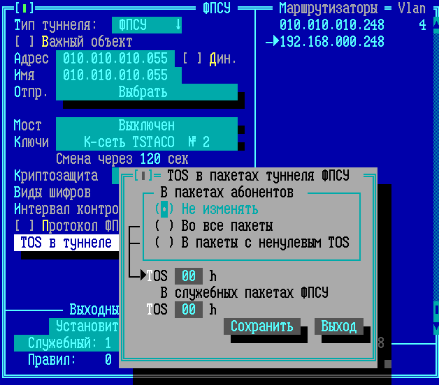 TOS в туннеле – выбор типа обслуживания пользовательских пакетов в отдельном окне «TOS в пакетах туннеля ФПСУ».