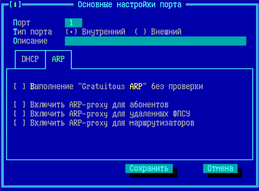 Включить ARP-proxy для абонентов флаг, разрешающий ARP-публикацию аппаратных адресов абонентов, описанных со стороны данного порта ФПСУ, в локальную сеть со стороны других портов.