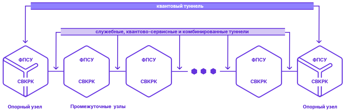 Общая структура квантовой сети предполагает существование опорных узлов, между которыми строится квантовый туннель для передачи защищенного на квантовых или КЗК-ключах пользовательского трафика, и промежуточных узлов, необходимых для выработки квантового ключа. Расстояние между опорными узлами может быть любым. Расстояние между соседними промежуточными узлами ограничено физическими возможностями оптического канала выработки квантовых ключей и возможностей устройств СВКРК, составляет от 50 до 100 км (приблизительные данные, точные данные следует смотреть в руководствах эксплуатации СВКРК). Порядок установления квантового туннеля между опорными узлами следующий: •между всеми промежуточными узлами устанавливаются служебные туннели; •каждая пара промежуточных узлов должна получить от устройств СВКРК квантовые ключи для организации квантово-сервисных туннелей между соседними узлами; •между всеми промежуточными узлами устанавливаются квантово-сервисные туннели; •опорные узлы через квантово-сервисные туннели получит КЗК-ключ для установления соединения с другим опорным узлом; •опорные узлы строят квантовый туннель, защищенный полученным КЗК-ключом. Пример линейной квантовой сети, состоящей из двух опорных узлов и произвольного количества промежуточных узлов, представлен на рисунке ниже: