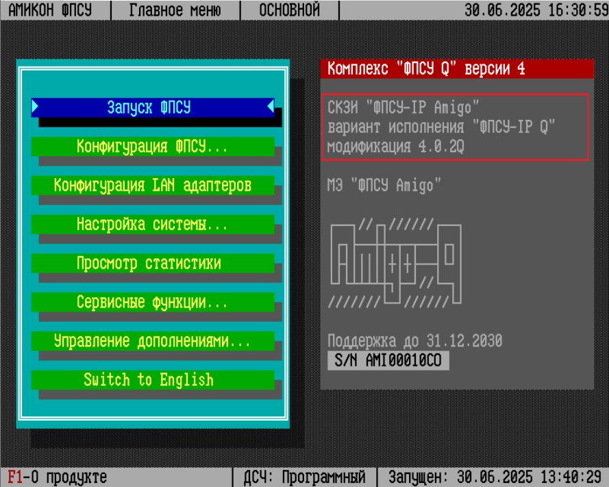 В разделе содержатся сведения о настройке ФПСУ 4-й версии для работы с устройствами квантового распределения ключей, описываются параметры настройки туннелей на квантовых и квантово-защищенных ключах. В разделе приводятся сведения, необходимые администратору для подключения устройств системы выработки квантового распределения ключей (устройств СВКРК) к ФПСУ. Указываются настройки, необходимые для построения VPN-туннелей с использованием квантовых и квантово-защищенных ключей. Для работы с устройствами квантового распределения ключей на ФПСУ должен быть установлен дополнительный программный модуль «Модуль-агент поддержки взаимодействия с устройствами КРК шифрования в качестве сервера промежуточного доверенного узла (ПДУ)», код продукта FPSUIP-SUB3-KRK-PDU. Начиная с 4-й версии, ФПСУ поддерживает работу с устройствами СВКРК. Для работы с СВКРК на ФПСУ должны быть предварительно установлено дополнение «option_krk_pdu». Главное меню ФПСУ, подготовленного для работы с устройствами СВКРК, содержит надписи «Комплекс "ФПСУ Q" версии 4», «СКЗИ "ФПСУ-IP Amigo"», «вариант исполнения "ФПСУ-IP Q"» и «модификация 4.0.2Q».