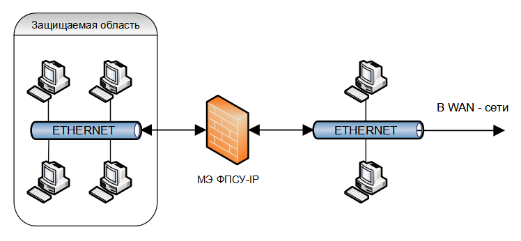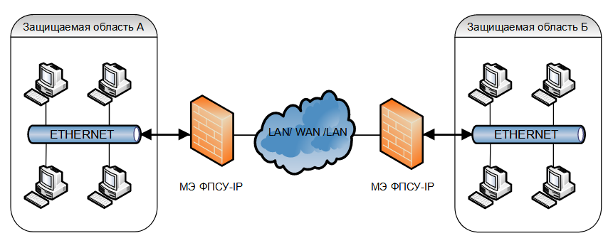 Программно-аппаратный «ФПСУ-IP» аппаратно подключается в разрыв цепи между защищаемой областью и остальной частью локальной сети парой физических линий (одна к защищаемой области, другая к остальной сети) таким образом, чтобы все входящие и исходящие из области потоки данных проходили через «ФПСУ-IP». Если область связана с сетью более чем в одной точке (транзитная область), «ФПСУ-IP» должны быть установлены на каждом выходе из неё. Вследствие поддержки программным обеспечением «ФПСУ-IP» режима «ARP-proxy» включение его в сеть не требует изменения её топологии или изменения конфигурационной информации уже существующей в сети аппаратуры, и не имеет ограничений на размер защищаемой области. Основная функция «ФПСУ-IP» заключается в том, что в соответствии с установленными администратором правилами он анализирует входящие и исходящие пакеты данных IP-протокола по совокупности критериев, осуществляет контроль доступа к ресурсам сети и определяет возможность передачи данных. На начальном этапе анализа все пакеты, поступающие на каждый из интерфейсов «ФПСУ-IP», контролируются на предмет корректности их формата и соответствия стандартам стека IP-протоколов. Если начальная обработка пакета осуществлена успешно, пакет будет передан для анализа в подсистему фильтрации «ФПСУ-IP». Фильтрация пакетов IP-протокола, производимая «ФПСУ-IP», заключается в сопоставлении полей IP-пакета установленным администратором правилам. На основании произведенного анализа принимается решение о допустимости дальнейшей передачи пакета абоненту-получателю, о необходимости дальнейшей идентификации и аутентификации пакета, а также о методах передачи данных и способах контроля за процессом приёма/передачи данных. Применяемый «ФПСУ-IP» механизм контроля передачи пакетов на сетевом уровне позволяет задавать в качестве критериев фильтрации: •регистрационные данные комплексов «ФПСУ-IP/Клиент»; •IP-адреса и MAC-адреса отправителя и получателя; •день недели и время соединения; •используемые протоколы транспортного уровня; •используемые порты TCP и UDP соединений; •разрешённые режимы работы абонентов (см. ниже); •разрешённые парные связи абонентов и «ФПСУ-IP/Клиентов». В зависимости от топологии сети и от требований политики безопасности организации возможны несколько вариантов применения «ФПСУ-IP» (функциональные схемы приведены ниже) и различные режимы его работы. В простейшем случае обмен IP-пакетами абонентов сегмента ЛВС с другими абонентами может осуществляться через один «ФПСУ-IP» (см. рисунок ниже). Для оконечной области достаточно установить один «ФПСУ-IP» на выходе из неё, для транзитной области необходимо защитить «ФПСУ-IP» каждый выход. ![]() Таким образом, из локальной сети выделяется группа абонентов (защищаемая область), для которых обмен IP-пакетами с остальными абонентами сети может быть специальным образом регламентирован и проконтролирован. Применяя «ФПСУ-IP» по этой схеме, можно разделить локальную сеть на две части (не меняя при этом IP-адресов и установок сетевого программного обеспечения хостов), одна из которых защищена, а абонентам другой будет разрешён обычный обмен пакетами. По этой же схеме можно установить «ФПСУ-IP» на выходе из локальной сети в удалённые сети и защитить работу всей локальной сети. Если обмен пакетами абонентов будет произ