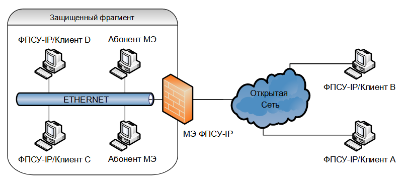На схеме (см. рисунок ниже), «ФПСУ-IP» обеспечивает пользователям «ФПСУ-IP/Клиентов» А и В безопасный доступ к абонентам защищаемой им подсети. Взаимодействуя через «ФПСУ-IP» друг с другом, «ФПСУ-IP/Клиенты» А и В образуют VPN-подсеть в открытых сетях, а «ФПСУ-IP/Клиенты» С и D ‑ VPN‑подсеть внутри защищённого фрагмента. Каждый из «ФПСУ-IP/Клиентов» А и В может также образовывать VPN-соединения через «ФПСУ-IP» с «ФПСУ-IP/Клиентами» С и D. В процессах идентификации, аутентификации и фильтрации запросов «ФПСУ-IP/Клиентов» участвуют не их IP-адреса, а ключевые данные пользователя «ФПСУ-IP/Клиента», которые выдаются пользователям с помощью программы ЦГКК. Поэтому доступ «ФПСУ-IP/Клиентов» к защищаемым «ФПСУ-IP» рабочим станциям может быть реализован с произвольной рабочей станции, оборудованной «ФПСУ-IP/Клиентом» (более подробную информацию см. в руководстве пользователя «ФПСУ‑IP/Клиента»). «ФПСУ-IP» имеет средства защиты от вмешательства в логику его работы, а также защиты его информационной и программной частей от несанкционированного доступа. Компьютер, оборудованный «ФПСУ-IP», не может содержать постороннего программного обеспечения. Специальная подсистема «ФПСУ-IP» создает на компьютере собственную (изолированную и функционально замкнутую) программную среду, предоставляя администраторам возможность управлять его работой - конфигурировать его (устанавливать и редактировать правила фильтрации, настраивать «ФПСУ-IP» на параметры сетевого оборудования, подключать желаемое оборудование и специальное программное обеспечение и т.д.), а также просматривать и записывать на съемные носители регистрационную информацию. «ФПСУ-IP» осуществляет и разграничивает доступ к своим модулям и подсистемам администраторов по правам. Локальные администраторы делятся по правам доступа на четыре логических класса: «оператор», «инженер», «администратор» и «Главный администратор», для каждого из которых строго определяется область доступных действий. Например, администратор класса «оператор» имеет право только запустить «ФПСУ-IP», остальные операции по конфигурации и управлению «ФПСУ-IP» будут ему недоступны. Идентификация и аутентификация администраторов с соответствующими правами осуществляется с использованием электронных идентификаторов touch-memory и символьного пароля. В «ФПСУ-IP» реализован механизм регистрации и учета ТМ‑идентификаторов. При работе «ФПСУ-IP» информация о его работе и происходящих событиях регистрируется - накапливается в специальном хранилище для последующего просмотра и обработки администраторами, а также отображается на экране монитора (в частности, результат фильтрации и попытки нарушения правил фильтрации). Хранилище регистрационной информации защищается от НСД посредством доступа к нему по предъявлению ТМ-идентификатора соответствующего класса и невозможности изъятия данных (за исключением автоматического вытеснения начальных записей при переполнении). Во избежание потерь регистрационной информации её можно снимать на внешние носители или выгружать в УА ФПСУ-IP для последующего хранения или анализа. «ФПСУ-IP» укомплектован подсистемой автозапуска, предназначенной для автоматического возобновления работы подсистемы фильтрации после сбоев электропитания в отсутствие оператора. Подсистема автозапуска настраиваетс