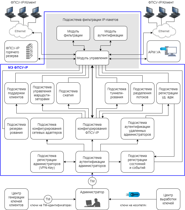 Структурная схема комплекса «ФПСУ-IP», отражающая взаимосвязь работы его подсистем, представлена ниже на рисунке: