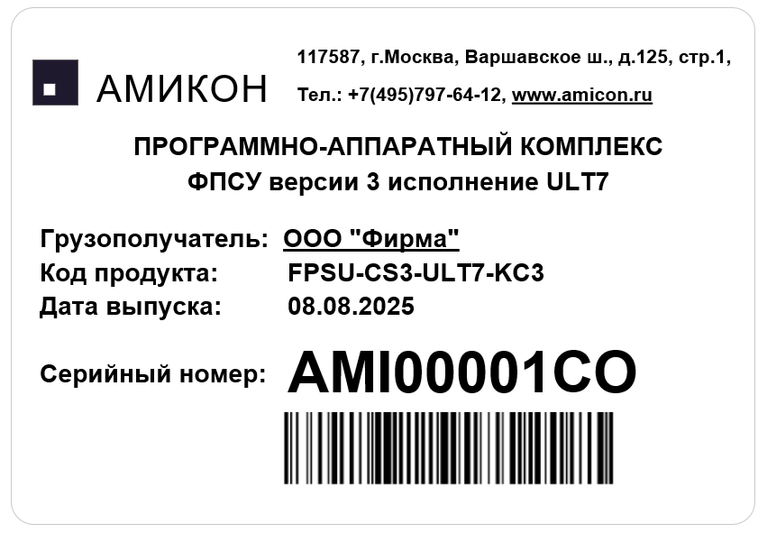 На корпусе аппаратной платформы на верхней панели размещается этикетка с серийным номером ПАК ФПСУ-IP, версией ПО ФПСУ-IP, датой выпуска и серийным номером аппаратной платформы. Этикетка с серийным номером может быть продублирована на передней панели.