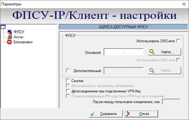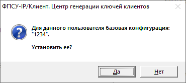 Окно параметров имеет несколько вкладок для формирования настроек: •Вкладка «ФПСУ» предназначена для настройки подключения к ФПСУ-IP. •Вкладка «Хосты» предназначена для настройки рабочих станций через ФПСУ-IP. •Вкладка «Блокировки» предназначена для настройки блокировок пакетов при установленном VPN-туннеле с ФПСУ-IP. Если для текущей Криптосети Клиентов или группы была установлена конфигурация по умолчанию, то будет предложено установить выбранную базовую конфигурацию.