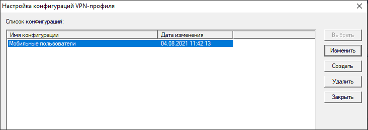 В окне списка конфигураций следует создать шаблон конфигурации (см. пункт «Создание шаблона конфигурации VPN-профиля»). Окно со списком конфигураций содержит следующие командные кнопки: