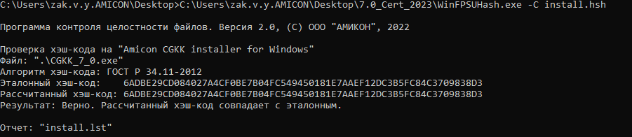 Контроль целостности инсталляционного модуля программы «Центр генерации ключей Клиентов» осуществляется на начальном этапе установки ЦГКК (до запуска файла CGKK_7_0.exe), и производится при помощи специальной программы WinFPSUHash.exe. При проверке целостности ЦГКК программой WinFPSUHash.exe используется поставляемый вместе с ЦГКК файл install.hsh, содержащий эталонные контрольные данные, сравнение с которыми производится при проверке. Контроль целостности осуществляется запуском программного модуля WinFPSUHash.exe из командной строки операционной системы Windows, из предварительно запущенной командной оболочки (например, сmd или PowerShell) или с помощью пункта «Выполнить» меню «Пуск», указывается полный путь к программному модулю с параметром проверки по файлу хэша и дополнительным параметром install.hsh. Программа WinFPSUHash.exe должна запускаться из того же каталога, в котором находится файл CGKK_7_0.exe.