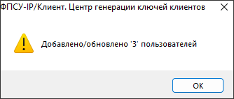 Для продолжения следует нажать кнопку «ОК». В появившемся окне необходимо выбрать путь к нужному файлу, после чего в открывшемся окне создания инициализирующей последовательности для программного датчика случайных чисел потребуется перемещать указатель мыши без нажатия на клавиши в пределах окна. После заполнения строки состояния, расположенной под текстом, датчик случайных чисел будет инициализирован. На экран будет выведено сообщение о добавлении пользователей: