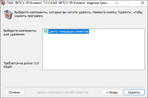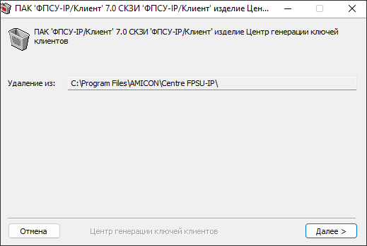 Для удаления программного обеспечения ЦГКК с компьютера необходимо запустить файл «amivpn-uninst.exe», находящийся в каталоге программы, или выполнить удаление стандартным для Windows образом через последовательность команд «Панель управления» → «Установка и удаление программ», найдя приложение ««ПАК 'ФПСУ-IP/Клиент' 7.0 СКЗИ 'ФПСУ-IP/Клиент' Изделие Центр генерации ключей клиентов»» и нажав кнопку «Удалить». Откроется окно, в котором отобразится путь к папке с установленным программным обеспечением.