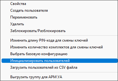 При инициализации пользователей из группы пользователей, работающих с ФПСУ-IP/Клиентом с применением устройства «VPN-Key», могут быть введены сведения об устройствах «VPN-Key» для учёта и дальнейшей инвентаризации устройств. Для инициализации всех пользователей группы с USB-токеном выбрать группу и в контекстном меню команду «Инициализировать пользователей».