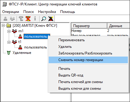 Номер генерации – числовой счетчик-идентификатор сгенерированных ЦГКК ключевых данных пользователя Криптосети ФПСУ-IP/Клиентов (изменяется от 1 до 256, по умолчанию равен 1). Записывается в VPN-профиль ФПСУ-IP/Клиента при инициализации VPN-Key или выдаче VPN-профиля в файл. Номер генерации, записанный в VPN-профиль ФПСУ-IP/Клиента, должен соответствовать тому, что указан на ФПСУ-IP, иначе ФПСУ-IP/Клиент не сможет соединиться с ФПСУ-IP. Номер генерации ключевых данных может быть изменен администратором ЦГКК. После изменения номера генерации рекомендуется выдать ключевые данные для смены. Для смены номера генерации выбрать пользователя, по нажатию правой клавиши мыши в контекстном меню выбрать команду «Сменить номер генерации».