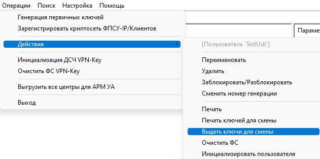 Срок действия ключевой информации отсчитывается с момента генерации ключевых данных и не должен превышать 15 месяцев. До истечения срока действия текущих ключевых данных требуется повторно сгенерировать и установить новые ключевые данные на местах использования СКЗИ. Для смены ключевой информации VPN-профиля программного, программно-аппаратного Клиента или мобильного приложения «ФПСУ-IP/Клиент» на ЦГКК генерируются ключи, которые записываются в виде файла формата *.bin или графического QR-кода. Для того, чтобы выдать ключ для замены, необходимо: