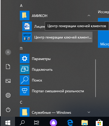 После установки на ПЭВМ программного обеспечения ЦГКК, в меню «Пуск» операционной системы WINDOWS будет создан пункт «АМИКОН», в котором должно отображаться название «Центр генерации ключей клиентов». Запустить программу можно напрямую из каталога, приложение «%Program Files%AMICON\Centre FPSU-IP\KeyGen.exe».