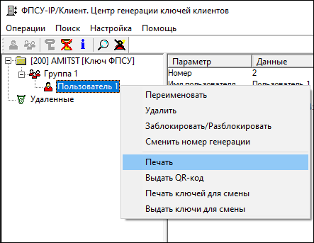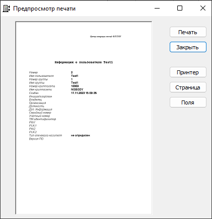 Информация по отдельному пользователю, созданному в ЦГКК, может быть выведена на печать посредством выполнения команды контекстного меню пользователя «Печать».