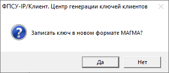 По нажатию кнопки «Да» ключ записывается в «VPN-Key» с признаком поддержки алгоритмов шифрования в соответствии с ГОСТ 34.12–2015 (блочный шифр «Магма»), по нажатию кнопки «Нет» - с признаком поддержки алгоритмов шифрования в соответствии с ГОСТ 28147-89.