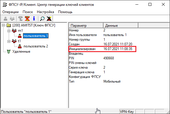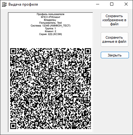 Графический файл формата *.png для последующего вывода на экран ЦГКК формируется при нажатии на кнопку «Сохранить изображение в файл». Также предоставляется возможность сохранить сгенерированный QR-код в виде файла формата *.bin (по нажатию на кнопку «Сохранить данные в файл»). В этом слу-чае файл необходимо передать доверенным образом на АРМ пользователя ФПСУ-IP/Клиент. Критерием успешности процесса инициализации пользователя мобильной груп-пы (без USB-токена) является проставленная дата инициализации.