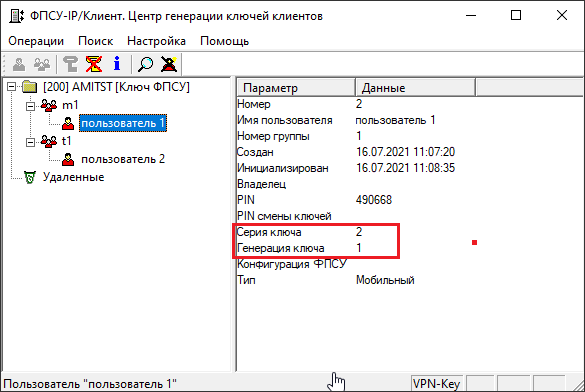При инициализации пользователя мобильной группы (без USB-токена) в QR-код записываются: • системные параметры пользователя — номер Криптосети, номер группы и номер пользователя; • ключевые данные пользователя Криптосети Клиентов; • номер серии общесистемного ключа; • номер генерации ключевых данных; • дата инициализации. Номер серии общесистемного ключа Криптосети ЦГКК, с помощью которого инициализировали пользователя, можно посмотреть в поле «Серия ключа» при выборе пользователя в основном окне программы. Номер серии начинается с единицы; при повторной инициализации пользователя, номер серии, как правило, увеличивают на один. Для удобства контроля номера серии большой группы пользователей, в основном окне программы можно отметить одним фоновым цветом иконки тех пользователей, которые имеют одинаковый номер серии (для этого необходимо в общих настройках программы ввести нужную серию ключа в поле «Выделять серию» - см. пункт «Настройки ЦГКК»). Номер генерации ключевых данных пользователя можно просмотреть в поле «Генерация ключа». Может быть изменен по команде контекстного меню «Сменить номер генерации» (см. пункт «Смена номера генерации ключевых данных»).