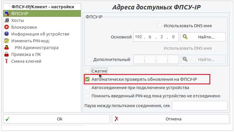 Для установки режима автоматического запроса обновлений ПО необходимо войти в меню ФПСУ-IP/Клиента и выбрать команду «Настройки VPN-Key» или «Программный клиент/Настройки». После регистрации с правами администратора (см. разделы «Регистрация администратора в программно-аппаратном Клиенте» или «Настройка параметров ФПСУ-IP/Клиента» соответственно) нужно выбрать в списке настроек строку «ФПСУ-IP».