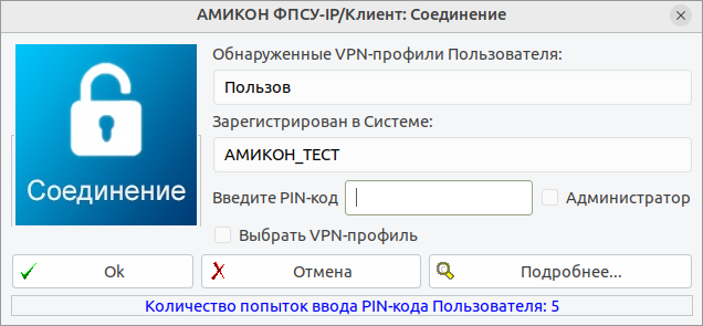 На экран будет выдаваться сообщение о начале регистрации пользователя, отображающее данные VPN-профиля, авторизовавшегося в ФПСУ-IP/Клиенте последним. В том случае, если последняя авторизация производилась для VPN-профиля пользователя программного Клиента, флаг «Администратор» в окне регистрации будет отсутствовать (раздел «Соединение программного Клиента с ФПСУ-IP»). При выборе опции «Выбрать VPN-профиль» появятся дополнительные возможности в окне интерфейса, позволяющие выбрать: