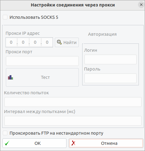 Для соединения с ФПСУ-IP через прокси-сервер используется команда «Сетевые настройки» основного меню. При включении опции «Использовать SOCKS 5», ФПСУ-IP/Клиент получает возможность работать с указанным по IP-адресу прокси-сервером на выбранном порту. Соединение использует UDP протокол для связи с прокси-сервером и внешним ФПСУ-IP. Каждое SOCKS-соединение проходит стадию аутентификации, если она требуется. ФПСУ-IP/Клиент поддерживает метод аутентификации на прокси-сервере с использованием имени пользователя (логина) и пароля по спецификации протокола SOCKS 5.