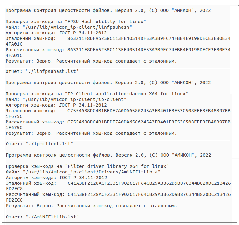 При совпадении полученных данных с эталоном будет выведено сообщение «Верно. Рассчитанный хэш-код совпадает с эталонным». Результат выполнения проверки по каждому файлу будет выведен на экран, а также сохранен в подкаталог проверки в файлы листинга AmiNFFltLib.lst, linfpsuhash.lst, ip-client.lst, находящиеся в папке /usr/lib/Amicon_ip-client/Hash. Файлы листинга содержат текст в кириллической кодировке и могут быть открыты любым текстовым редактором. В случае возникновения ошибки в процессе контроля целостности программного обеспечения следует прекратить дальнейшую работу с ФПСУ-IP/Клиентом. Рекомендуется выполнить повторную инсталляцию ФПСУ-IP/Клиента.