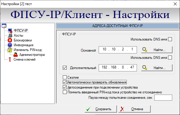 Для установки режима автоматического запроса обновлений ПО необходимо войти в меню ФПСУ-IP/Клиента и выбрать команду «Программный клиент». После регистрации с правами администратора (см. раздел «Регистрация администратора в программно-аппаратном Клиенте») нужно выбрать в списке настроек строку «ФПСУ-IP».