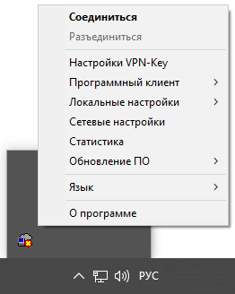 Программное обеспечение ФПСУ-IP/Клиента загружается автоматически, при старте операционной системы Windows (до регистрации и входа пользователя в операционной системе). После регистрации и входа пользователя в области уведомлений на панели задач Windows отображается его значок: При установке по умолчанию программное обеспечение ФПСУ-IP/Клиента находится в папке «SYSTEMDISK:\Program Files\AMICON\Client FPSU-IP». Возможен старт ПО ФПСУ-IP/Клиент вручную запуском исполняемого файла «ip‑client.exe», находящегося в папке программного обеспечения. Для вызова меню необходимо нажать правой клавишей мыши на значке программы. На экран будет выдано меню ФПСУ-IP/Клиента, содержащее следующие команды: