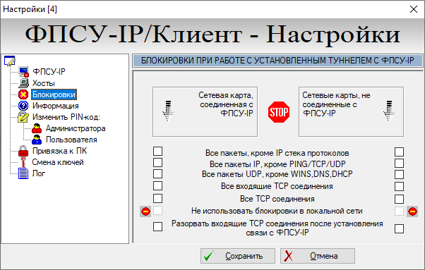 Если введенный код не соответствует данным, заложенным в подключенном VPN-Key, он будет запрошен снова. По истечении установленного количества неудачных попыток система начнет запрашивать десятизначный PUK-код администратора. Если попытки ввести PUK-код также не увенчаются успехом, предъявленный VPN-Key будет заблокирован, и дальнейшая работа с текущим VPN-профилем (на любом компьютере) окажется невозможной. Если вводимые персональные коды верны и количество попыток их ввода не превышено, регистрация пользователя считается завершенной. Если регистрация администратора завершена успешно, на экран монитора будет выведено окно настроек. Левая часть окна содержит список доступных параметров VPN-профиля, а правая отображает значения установок текущего параметра. Во время существования VPN-туннеля с ФПСУ-IP, ФПСУ-IP/Клиент может обмениваться данными с другими рабочими станциями сети в обычном открытом режиме. Администраторы ФПСУ-IP и ФПСУ-IP/Клиента могут ограничивать сетевое взаимодействие компьютера пользователя во время установленного соединения с ФПСУ-IP. В интерфейсе ФПСУ-IP/Клиента такие ограничения называются «блокировками» и доступны для изменения через меню настройки VPN-Key или VPN-профиля. В левой части окна необходимо выбрать строку «Блокировки», после чего справа появится список блокировок, позволяющий установить правила фильтрации входящих и исходящих пакетов данных на время существования VPN-туннелей с ФПСУ-IP. В группе переключателей нужно отметить те соединения, которые будут запрещены во время сеансов с ФПСУ-IP. Ограничения на прием и передачу пакетов могут быть установлены как для сетевого адаптера, связанного с ФПСУ-IP, так и для других сетевых адаптеров ФПСУ-IP/Клиент. Во время установки VPN-туннеля с ФПСУ-IP правила фильтрации могут быть принудительно дополнены в соответствии с указаниями администратора ФПСУ-IP - в этом случае во время соединения около соответствующего поля будет отображаться знак запрета (знак «въезд запрещен»). Эти правила имеют более высокий приоритет, чем настройки устройства VPN-Key. Кроме того, во время существования VPN-туннеля могут работать ограничения на прием и передачу пакетов, установленные локальным межсетевым экраном Клиента (см. раздел «Настройка локального межсетевого экрана ФПСУ-IP/Клиента»).