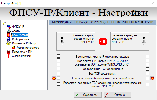 Во время существования VPN-туннеля с ФПСУ-IP, ФПСУ-IP/Клиент может обмениваться данными с другими рабочими станциями сети в обычном открытом режиме. Администраторы ФПСУ-IP и ФПСУ-IP/Клиента могут ограничивать сетевое взаимодействие компьютера пользователя во время установленного соединения с ФПСУ-IP. В интерфейсе ФПСУ-IP/Клиента такие ограничения называются «блокировками» и доступны для изменения через меню настройки VPN-профиля. В левой части окна необходимо выбрать строку «Блокировки», после чего справа появится список блокировок, позволяющий установить правила фильтрации входящих и исходящих пакетов данных на время существования VPN-туннелей с ФПСУ-IP. В группе переключателей нужно отметить те соединения, которые будут запрещены во время сеансов с ФПСУ-IP. Ограничения на прием и передачу пакетов могут быть установлены как для сетевого адаптера, связанного с ФПСУ-IP, так и для других сетевых адаптеров ФПСУ-IP/Клиент. Во время установки VPN-туннеля с ФПСУ-IP правила фильтрации могут быть принудительно дополнены в соответствии с указаниями администратора ФПСУ-IP - в этом случае во время соединения около соответствующего поля будет отображаться знак запрета (знак «въезд запрещен»). Эти правила имеют более высокий приоритет, чем настройки VPN-профиля. Кроме того, во время существования VPN-туннеля могут работать ограничения на прием и передачу пакетов, установленные пользователем (см. раздел «Настройка локального межсетевого экрана ФПСУ-IP/Клиента»).