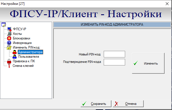Персональные идентификационные коды текущей конфигурации пользователя запрашиваются системой при попытках соединения ФПСУ-IP/Клиент с ФПСУ-IP, а коды администратора – при попытках редактирования текущей конфигурации находящихся в устройстве VPN-Key VPN-профилей. Для того чтобы изменить PIN-код администратора в левой части окна необходимо выбрать строку «Изменить PIN-код: Администратора». В поле появившегося окна следует ввести новый PIN-код и нажать кнопку «Изменить». PIN-код администратора будет заменен на введенный новый. Для того чтобы изменить PIN-код пользователя, необходимо выбрать курсором строку «Изменить PIN-код: Пользователя» и действовать аналогично описанной выше процедуре.