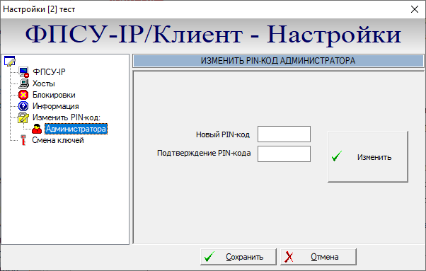 Персональным идентификатором доступа к VPN-профилю является PIN-код администратора (минимально 6 цифр, максимально - 32). Персональный идентификационный код VPN-профиля запрашивается программой при попытках соединения ФПСУ-IP/Клиент с ФПСУ-IP, и при попытках редактирования текущей конфигурации VPN-профиля. Следует учитывать, что при работе с Программным Клиентом пользователь с PIN-кодом доступа к VPN-профилю обладает правами администратора по умолчанию, соответственно изменение персонального идентификатора предусмотрено только для PIN-кода Администратора. Для того чтобы изменить PIN-код администратора, в левой части окна необходимо выбрать строку «Изменить PIN-код: Администратора». В поле появившегося окна следует ввести новый PIN-код и нажать кнопку «Изменить». PIN-код администратора будет заменен на введенный новый.