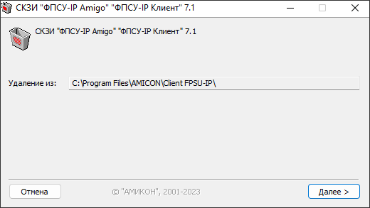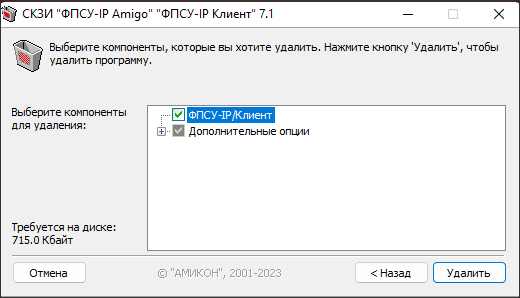 Перед удалением ФПСУ-IP/Клиента, использовавшегося в качестве Программного Клиента, в обязательном порядке следует удалить все загруженные профили и лицензию (см. п.п. Удаление VPN-профиля и Удаление лицензии). Для удаления программного обеспечения ФПСУ-IP/Клиент с компьютера необходимо запустить файл «amivpn-uninst.exe», находящийся в каталоге программы. Или выполнить удаление стандартным для Windows образом через последовательность команд «Панель управления» → «Установка и удаление программ», найдя приложение «СКЗИ "ФПСУ-IP Amigo" "ФПСУ-IP/Клиент" ХХ» (где ХХ - номер модификации) и нажав кнопку «Удалить». В качестве первого этапа деинсталляции будет предложено выбрать язык, соответствующий установленному.