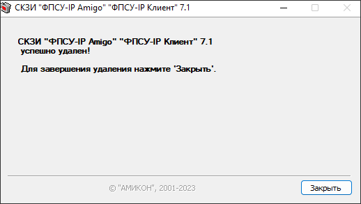Откроется окно успешного завершения деинсталляции. Для продолжения необходимо нажать кнопку «Закрыть»: