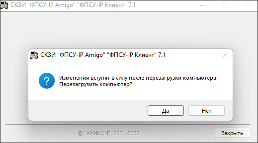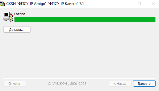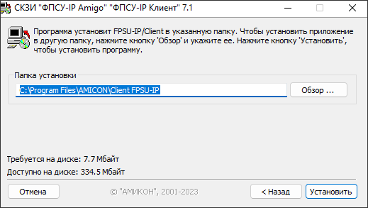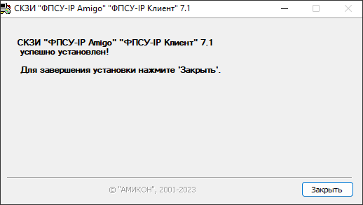 ВНИМАНИЕ! Установку программного обеспечения следует выполнять от имени пользователя, имеющего права локального администратора операционной системы (требуются для корректной установки службы «Amicon FPSU/IP-Client service»).