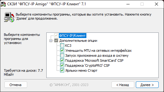 3. После принятия условий лицензионного соглашения необходимо выбрать установочные опции программного обеспечения ФПСУ-IP/Клиента.