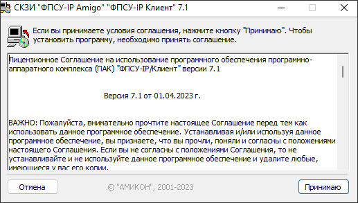 2. После выбора языка программа установки выдаст на экран лицензионное соглашение между пользователем ФПСУ‑IP/Клиента и ООО «АМИКОН». Для продолжения установки необходимо прочитать лицензионное соглашение и нажать кнопку «Принимаю» для согласия с условиями лицензионного соглашения, или отказаться от инсталляции при помощи кнопки «Отмена».