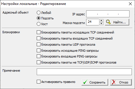 Переключатель в поле «Адресный объект» необходимо установить в нужное положение для выбора типа адреса, взаимодействие с которым описывается. Для хоста нужно указать его IP-адрес, для подсети - IP-адрес и маску (число значащих разрядов). Если сетевым службам компьютера доступны какие-либо средства разрешения Интернет-имен, по нажатию кнопки «Найти» можно запросить IP-адрес рабочей станции с известным именем у соответствующего сервера. Запись типа «Любой» создается для регламентации взаимодействия ФПСУ-IP/Клиент с явно не описанными хостами. В группе флагов «Блокировки» нужно указать типы соединений с описываемым адресом, которые будут запрещены при сетевом взаимодействии. В поле «Примечание» можно ввести, если это необходимо, справочную информацию по текущему правилу – она будет отображаться вместе с правилом в окне локальных настроек. Для включения правила необходимо установить флаг «Активировать правило». Если правило необходимо временно отключить - флаг необходимо снять. После нажатия кнопки «Сохранить» установленное правило будет отображаться в списке окна локальных настроек. Чтобы отредактировать какое-либо правило фильтрации, также необходимо нажать командную кнопку «Разрешить редактирование» в нижнем левом углу окна «Локальные настройки» (если пароль на редактирование устанавливался, нужно ввести его по запросу программы). Для изменения какой-либо записи нужно выбрать ее в списке и открыть окно редактирования двойным нажатием левой клавиши мыши (или нажатием кнопки «Изменить»). После внесения всех необходимых изменений необходимо нажать кнопку «Сохранить» в правой нижней части окна. Чтобы удалить какое-либо существующее правило фильтрации, нужно выбрать его в списке и нажать кнопку «Удалить» в правой нижней части окна локальных настроек. |