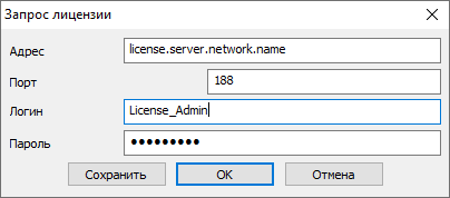 В открывшемся окне следует заполнить все поля. Адрес и порт сервера лицензирования, логин и пароль запрашивающего лицензию пользователя необходимо уточнять у администратора Сервера Лицензирования. Введенные данные можно сохранить в Программном Клиенте для последующих запросов, нажав клавишу «Сохранить». После заполнения полей подтвердите запрос к серверу, нажав клавишу «ОК». ФПСУ-IP/Клиент выполнит запрос к Серверу лицензирования. Если на Сервере лицензирования администратором разрешена выдача лицензии для указанного логина и пароля, то лицензия на Программный Клиент будет загружена по сети и установлена в ФПСУ-IP/Клиент. |