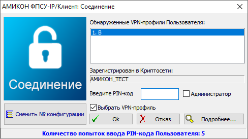 3. Если устройство VPN-Key успешно определилось операционной системой, на экране появится окно регистрации пользователя ФПСУ-IP/Клиент. Регистрация необходима для установления соединения ФПСУ-IP/Клиента с ФПСУ-IP и для настройки параметров работы.