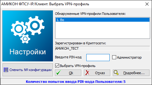 На экран монитора будет выдано окно регистрации, отображающее данные VPN-профиля, загруженные из устройства VPN-Key.