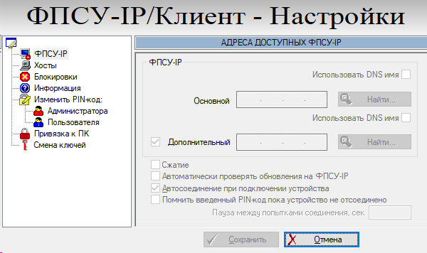 В поле «Основной» в правой части окна отображается основной IP-адрес ФПСУ-IP, через который осуществляется доступ ФПСУ-IP/Клиента к защищенным хостам. При наличии дополнительного ФПСУ-IP его адрес отображается в соответствующем поле. Если флаг «Автоматически проверять обновления» установлен, то при каждом соединении с ФПСУ‑IP (основным или дополнительным) ФПСУ-IP/Клиент будет запрашивать у него наличие новых версий программного обеспечения ФПСУ-IP/Клиент. Если флаг «Автосоединение при подключении VPN-Key» установлен, то при подключении VPN-Key в USB-порт рабочей станции с установленным ПО «ФПСУ‑IP/Клиент», автоматически будет произведена попытка соединения с ФПСУ-IP. Так же при установленном флаге будет произведена попытка соединения с ФПСУ-IP при старте ПО ФПСУ-IP/Клиент вручную, или после перезагрузки операционной системы (при наличии подключенного к рабочей станции VPN-Key). При установленном флаге «Помнить введенный PIN-код пока устройство не отсоединено» (флаг отображается только в версии ФПСУ-IP/Клиента, предназначенной для АТМ) один раз введенный PIN-код пользователя VPN-Key будет запомнен, и при дальнейших попытках установления VPN-туннеля с ФПСУ‑IP не будет выводится запрос его повторного ввода. PIN код сохраняется и при перезагрузках, вплоть до физического отсоединения устройства VPN-Key от USB порта рабочей станции. Запомненный PIN-код действует только для попыток установления соединения с ФПСУ‑IP, и не будет подставляться при попытках пользователя изменить конфигурацию VPN-Key. При введенном в поле «Пауза между попытками соединения, сек» значении попытки соединения с ФПСУ-IP будут повторяться с заданным интервалом. Если поле не заполнено, при команде на установление соединения ФПСУ-IP/Клиент сделает 10 попыток соединения сначала с основным ФПСУ-IP, затем с 10 попыток - с дополнительным. После чего, в случае неудачи, выдаст сообщение об отказе и прекратит попытки установления VPN-туннеля. Если в поле опции указано какое-то значение, после отказа в соединении от основного и дополнительного ФПСУ‑IP, ФПСУ-IP/Клиент через указанное время вновь попытается установить связь. В этом случае ФПСУ-IP/Клиент будет пытаться установить VPN-туннель с ФПСУ-IP до тех пор, пока не получит ответ. |