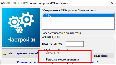Следует учитывать, что при установке в качестве места хранения ключей внутреннего накопителя компьютера, накопитель становится носителем ключевой ин-формации. Рекомендуется в качестве места хранения ключевой информации использовать съемный носитель («Соединение Программного Клиента с ФПСУ-IP»). При этом на жестком диске в папке программного обеспечения сохраняется VPN-профиль без ключа, а сам ключ записывается на съемный носитель. Чтобы использовать съемный диск в качестве носителя следует: