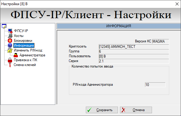 Следует учитывать, что при работе с Программным Клиентом пользователь обладает правами администратора, поэтому количество попыток ввода персонального идентификатора отображается только для PIN-кода Администратора. |