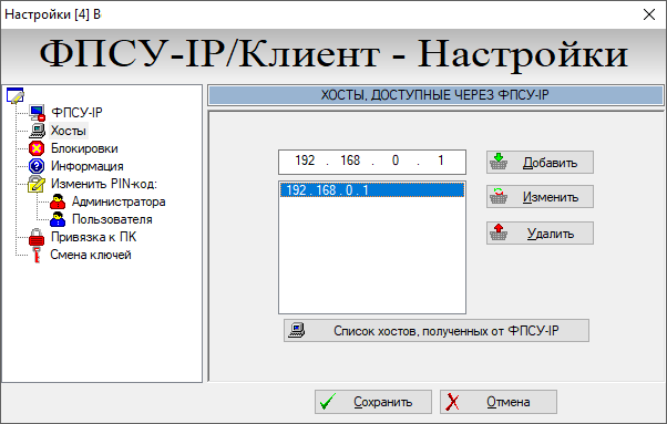 Если введенный код не соответствует данным, заложенным в подключенном VPN-Key, он будет запрошен снова. По истечении установленного количества неудачных попыток система начнет запрашивать десятизначный PUK-код администратора. Если попытки ввести PUK-код также не увенчаются успехом, предъявленный VPN-Key будет заблокирован, и дальнейшая работа с текущим VPN-профилем (на любом компьютере) окажется невозможной. Если вводимые персональные коды верны и количество попыток их ввода не превышено, регистрация пользователя считается завершенной. Если регистрация администратора завершена успешно, на экран монитора будет выведено окно настроек. Левая часть окна содержит список доступных параметров VPN-профиля, а правая отображает значения установок текущего параметра. Для отображения настроек работы с сетевыми ресурсами, доступными через туннель с ФПСУ-IP, в левой части окна настроек необходимо выделить строку «Хосты». Если VPN-профиль содержит IP-адреса рабочих станций, с которыми ФПСУ-IP/Клиент может работать через VPN-туннель, они будут отображаться в списке справа. Для введения новых IP‑адресов необходимо воспользоваться полем ввода над списком и кнопкой «Добавить». Список IP-адресов может быть также получен от ФПСУ-IP, где он формируется администратором ФПСУ-IP. Для его просмотра после установки VPN-туннеля с ФПСУ-IP необходимо нажать кнопку «Список хостов, полученных от ФПСУ-IP». Ранее добавленные в VPN-профиль адреса можно отредактировать или удалить из списка при помощи кнопок «Изменить» или «Удалить».