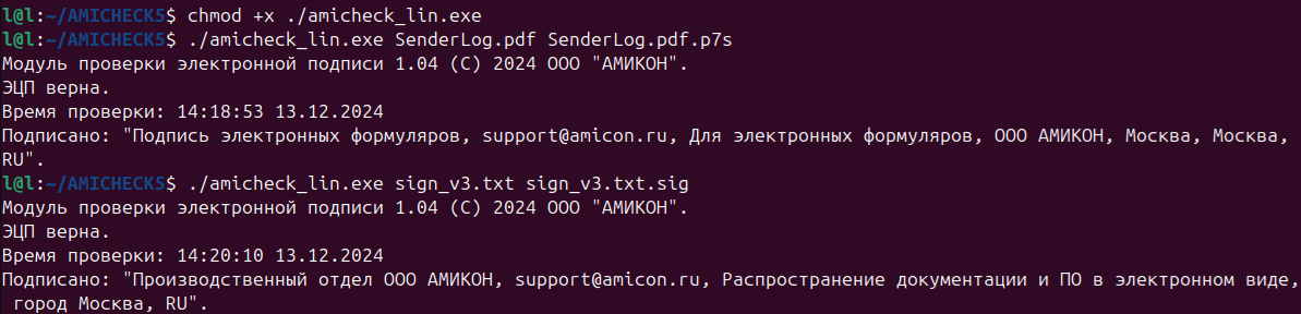Для запуска программы Amicheck не требуется предварительная установка в операционной системе. Запуск и выполнение программы осуществляется из терминала. В командной строке указывается полный путь к файлу программы Amicheck с дополнительными параметрами. По умолчанию проверка электронной подписи выбранного файла рассчитывается по алгоритму ГОСТ Р 34.10‑2012. Вызов программы: <путь и полное имя программы amicheck.exe> <путь и полное имя файла данных> <путь и полное имя файла подписи> В некоторых случаях требуется разрешение на запуск программы. Пример запуска программы из домашней директории в терминале c изменением прав доступа к файлу программы: cd AMICHECK5 chmod +x ./amicheck_lin.exe ./amicheck_lin.exe SenderLog.pdf SenderLog.pdf.p7s Команда запускается из каталога с программой, в котором находятся проверяемый файл и файл подписи.