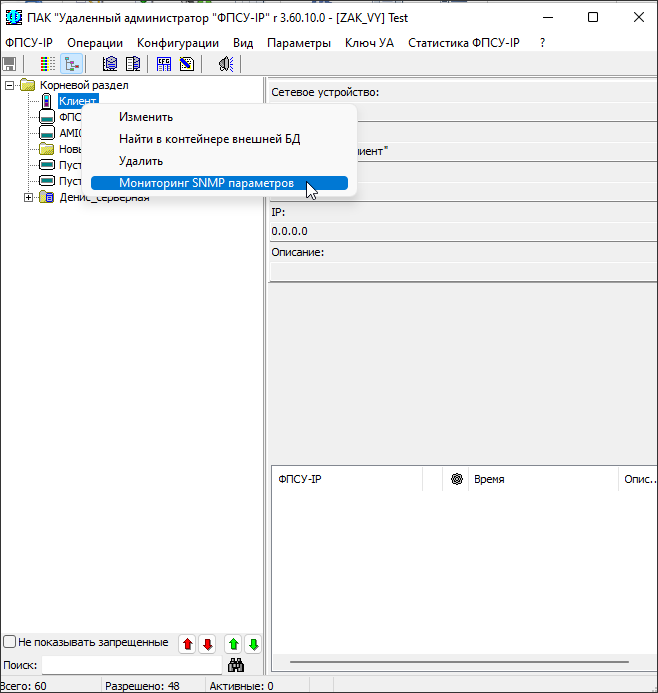 В открывшемся окне предоставляется возможность добавить новый тип сетевого устройства, отредактировать его наименование или удалить из общего списка. Так же предоставляется возможность синхронизировать список типов сетевых устройств со списком, хранящимся во внешней БД. По нажатию кнопки «ОК» сетевое устройство будет добавлено в корневой раздел списка ФПСУ-IP. Для сетевых устройств предусмотрено контекстное меню, вызываемое нажатием правой клавишей мыши: